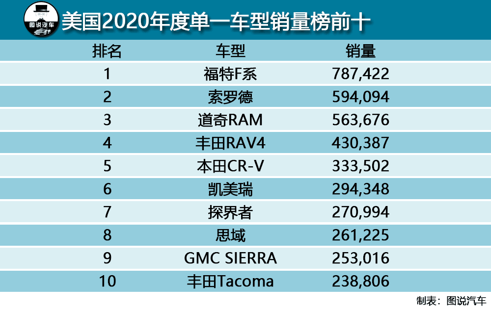 首先是美国车市,可以看到按照单一车型销量划分,第一到第十分别为:福特F系列、雪佛兰索罗德、道奇RAM、丰田RAV4、本田CR-V、丰田凯美瑞、雪佛兰探界者、本田思域、GMC SIERRA、丰田Tacoma。